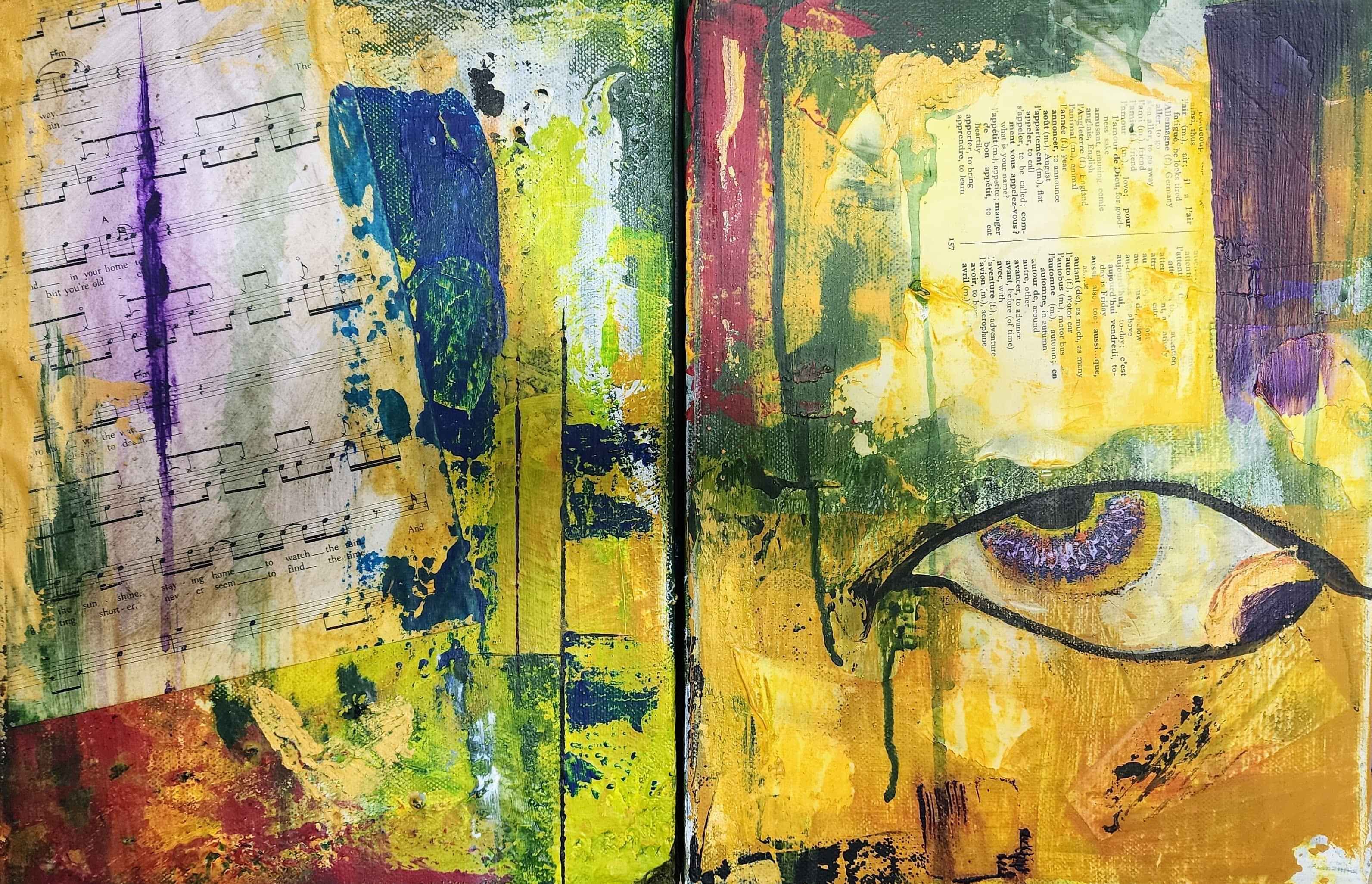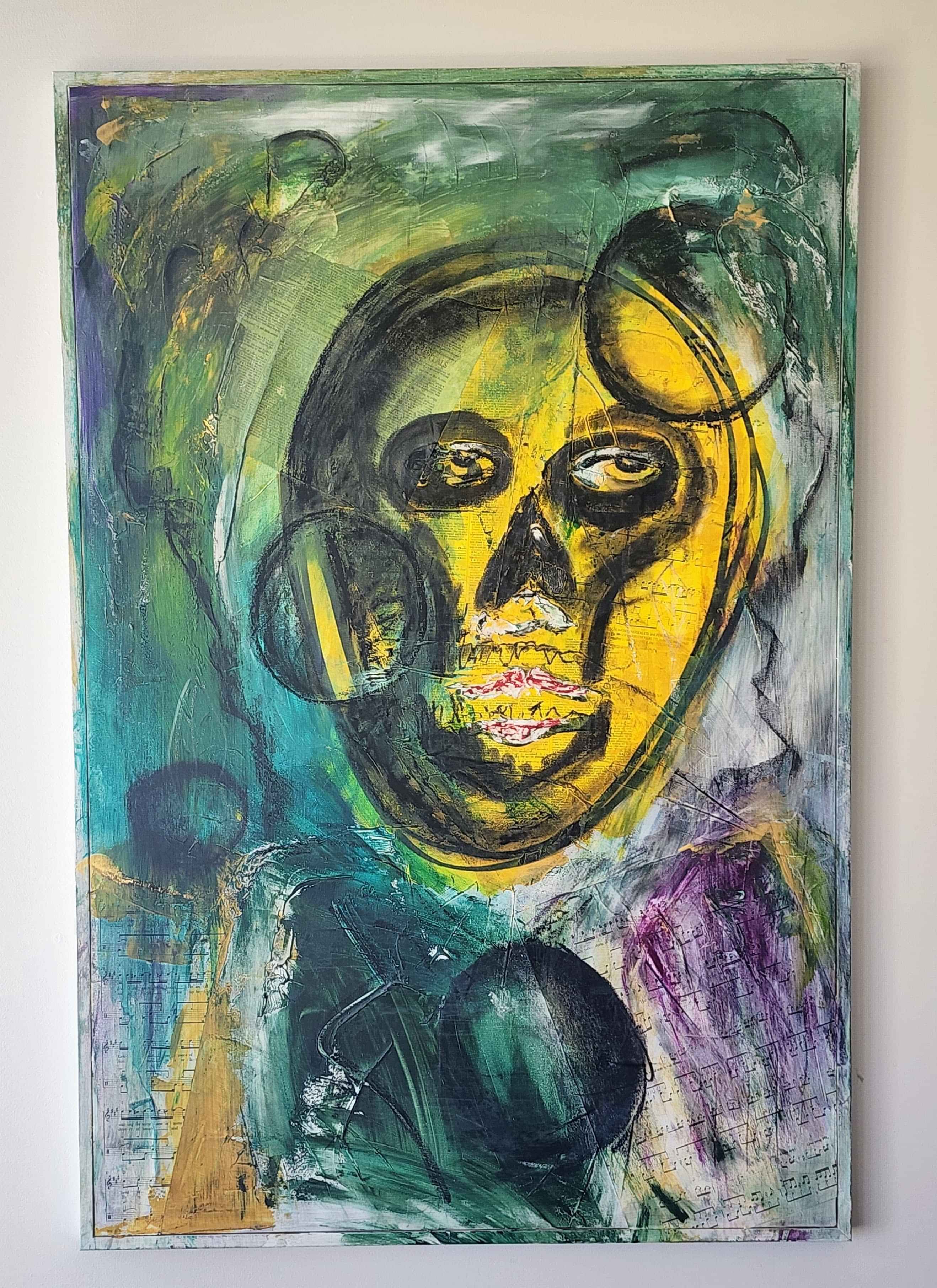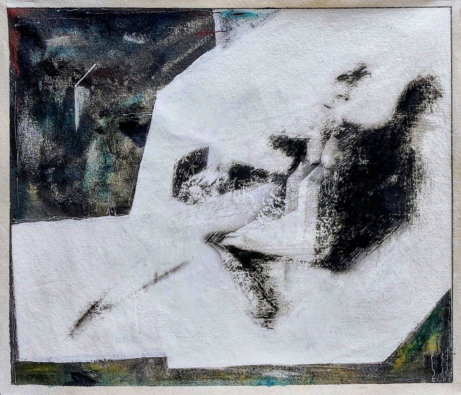 acrylic, ink, c0llage, wax 0n raw unframed canvas, 9oo x 7oo mm