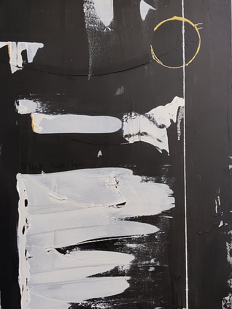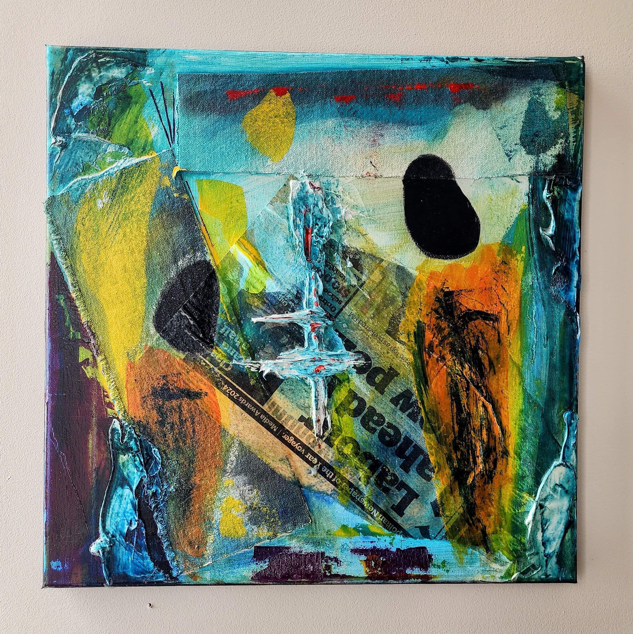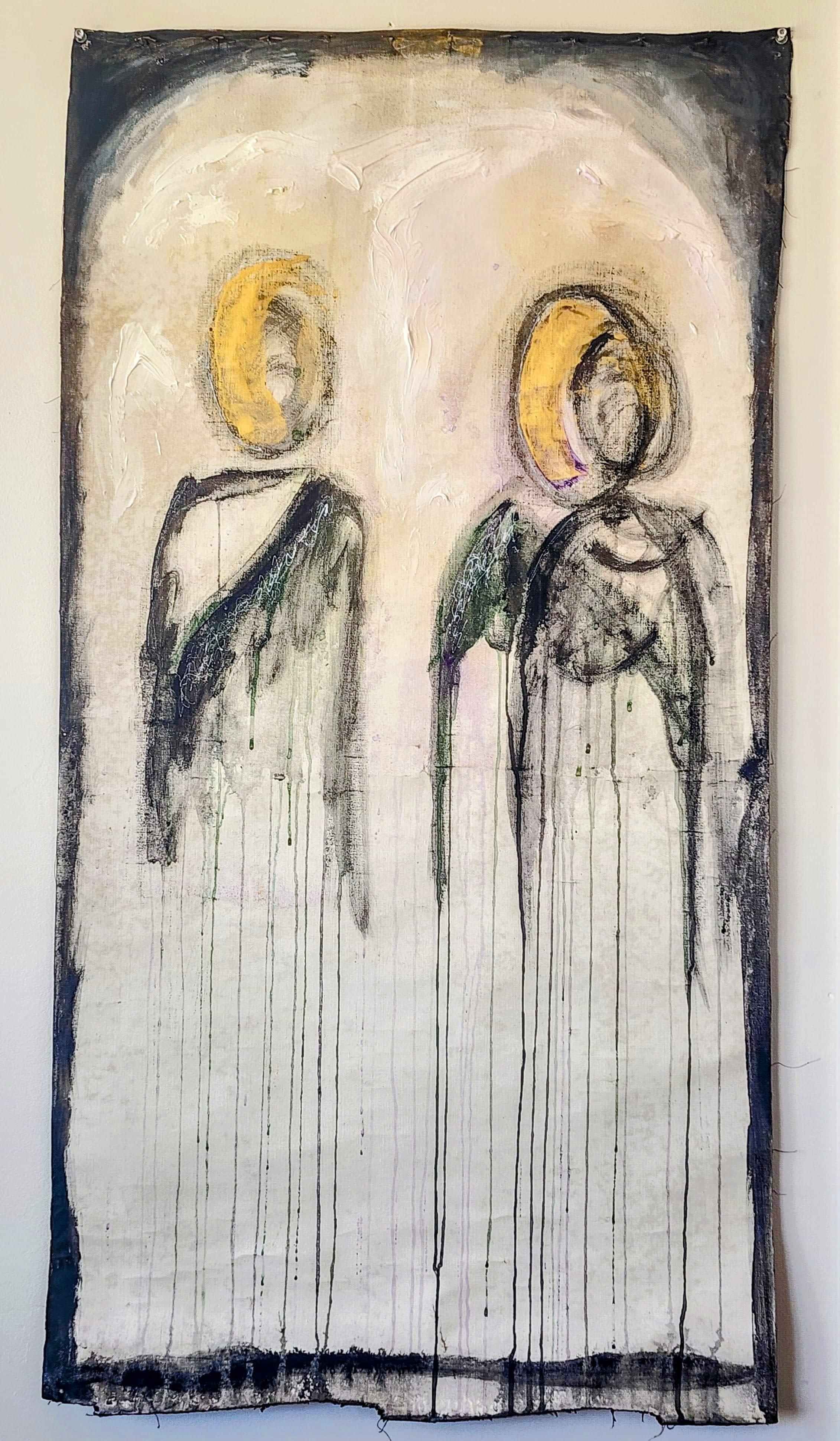 acrylic, ink, c0llage, wax 0n raw unframed canvas, 9oo x 7oo mm